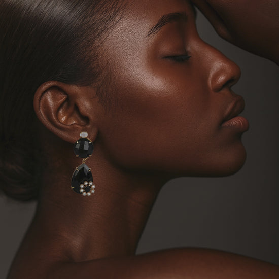 A celebration of deep earthly beauty, the Gaia Earrings pair luminous moonstone studs with rich, faceted black onyx drops. Crafted in 14k gold-plated, each drop is finished with a delicate floral cluster of semi-precious stones, adding a soft, radiant glow against the dramatic dark tones.