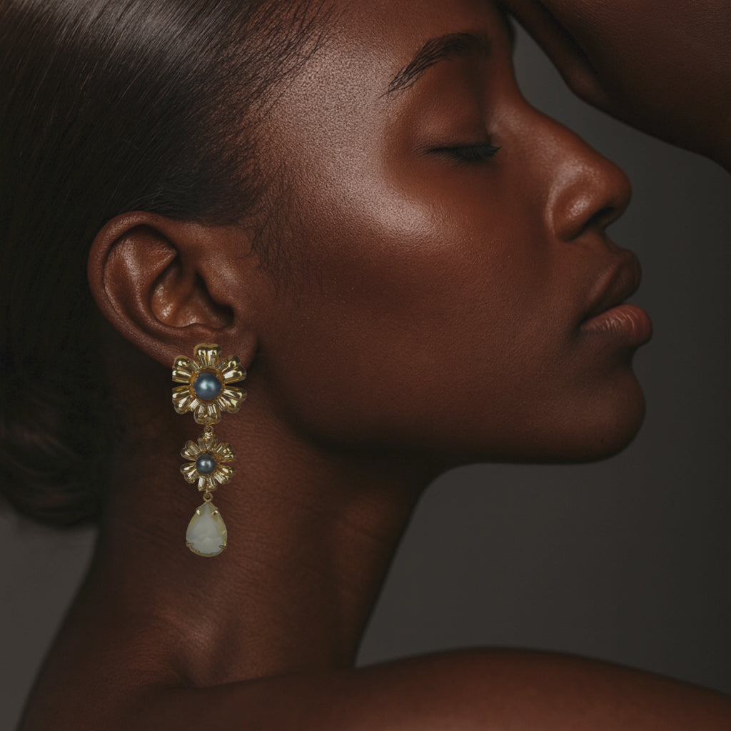 Crafted in 14k gold-plated metal, each floral element is set with a glowing semi-precious stone, while an opaline teardrop adds a soft, natural luminosity. Designed for versatility, the studs include a hidden hook, allowing you to wear them four ways—as delicate studs, as a single-drop style, or with the full cascading silhouette. A piece that evolves with your mood, grounded in nature’s quiet elegance.