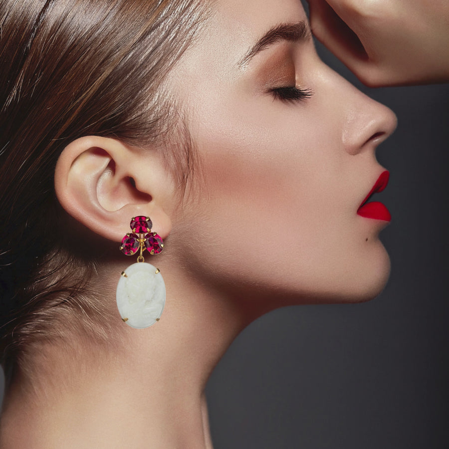 Introducing the new Artemisa Earrings, featuring a unique design inspired by vintage and Victorian styles. Accented with a cameo and removable drop, they showcase contrasting colors that highlight the spirit of spring. Pair them with the matching ring for a complete, elegant look.