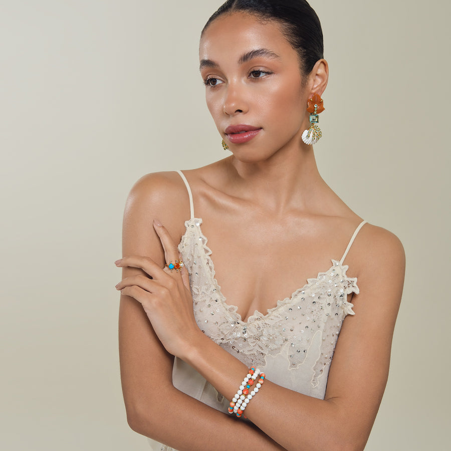 The Carmin Earrings feature a timeless shape made of semi-precious stones, with a removable drop that allows for versatile styling. Their retro and vintage design adds a charming touch to any look.