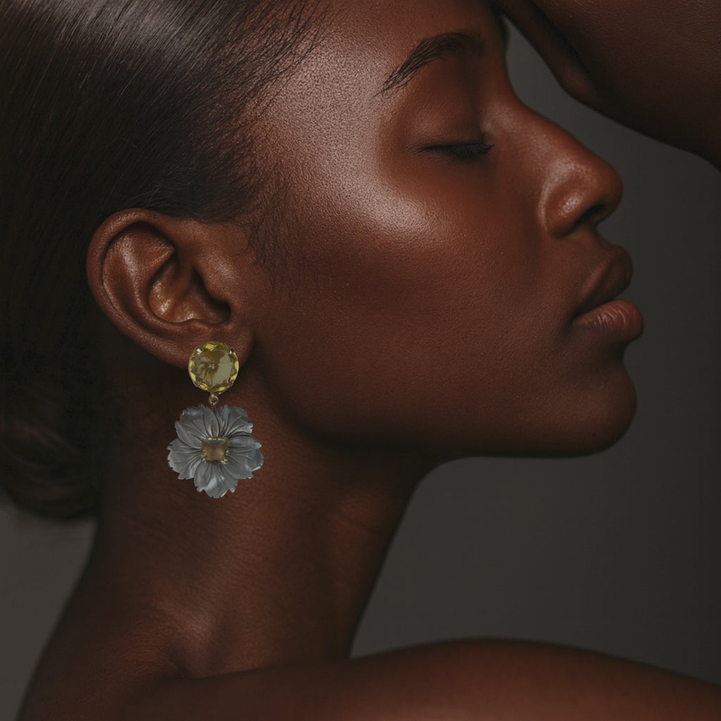 Blooming with sculptural beauty, the Kalika Earrings highlight hand-carved floral motifs crafted in 14k gold-plated metal. Each petal reflects soft iridescence, while a warm semi-precious stone glows at the center, paired with a faceted golden stud that adds a sunlit touch.